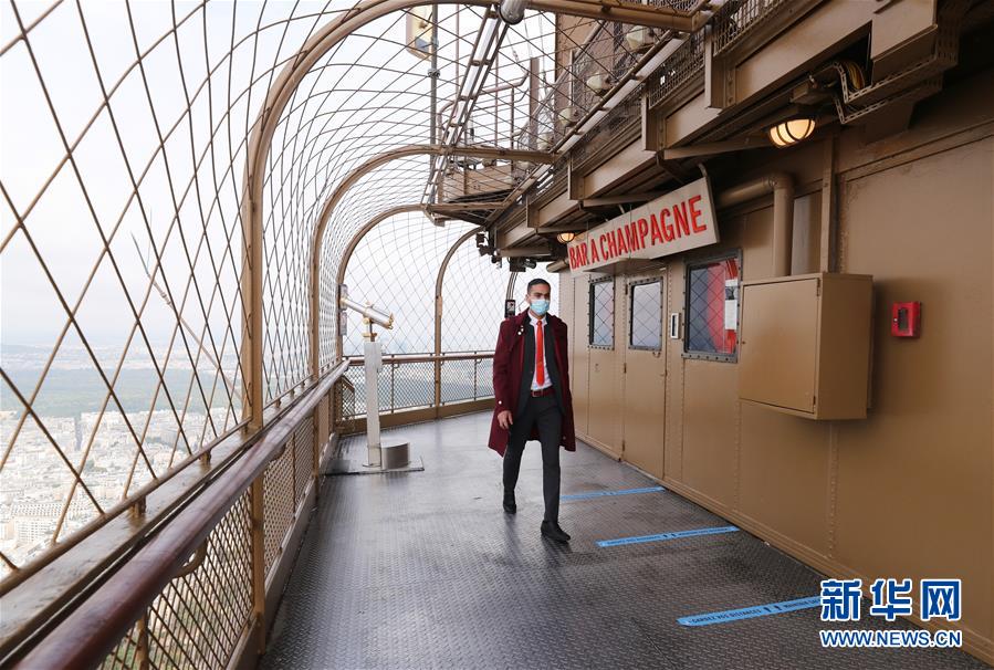 7月15日,工作人员在法国巴黎埃菲尔铁塔顶层观景平台准备迎客。新华社记者高静摄