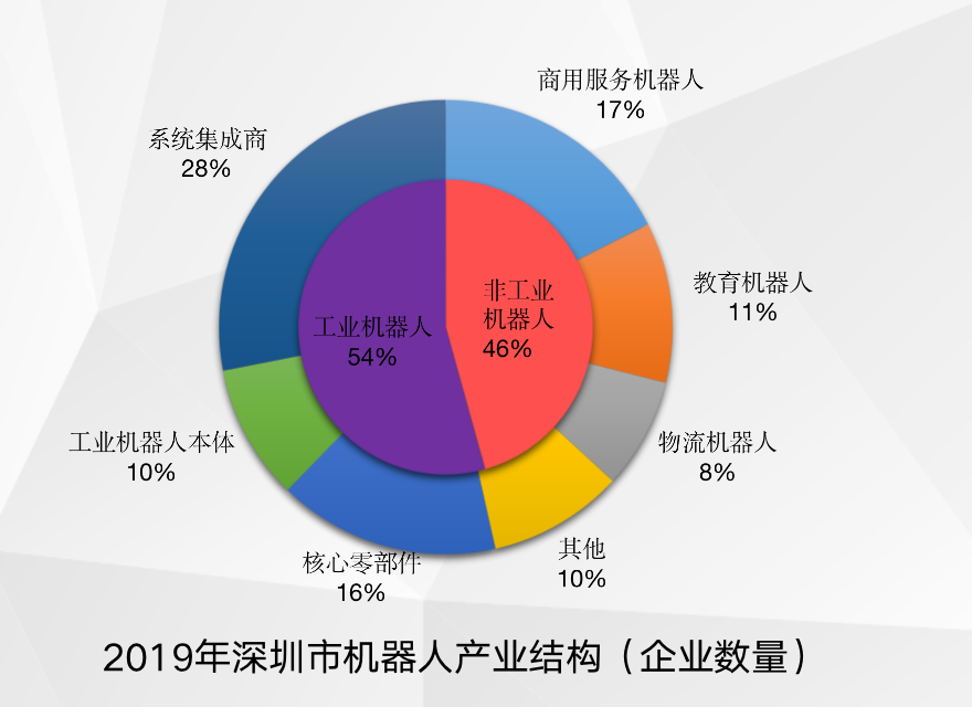 记者从深圳市机器人协会了解到,2019年深圳市机器人产业总产值为1257亿元,相比2018年的1178亿元同比增长6.73%;2019年深圳市机器人产业企业总数量达到757家,相比2018年的649家同比增长16.64%。在深圳1411家机器人相关企业中,工业机器人企业数量占比54%,产值占比65%;非工业机器人企业数量占比46%,产值占比35%。