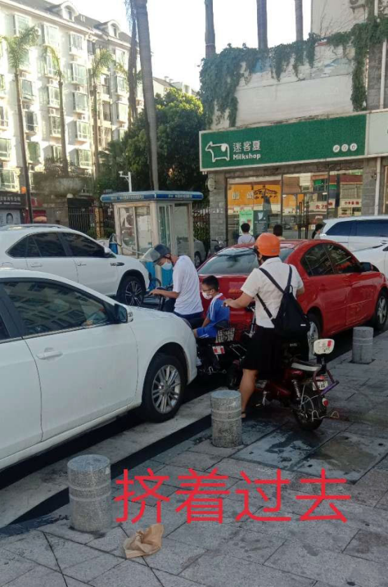 “美丽365花园门口的东环二路人行道变成私人停车场,好几个行人路过时,嘴里埋怨怎么车停在这里呢?”6月28日,网友“叶落知秋”留言。根据贴图所示,早上上班骑电动车上班的市民途径此地时要小心翼翼地绕行违停的小轿车,按网友的说法是“挤着过去”,非常不便,也很不安全。