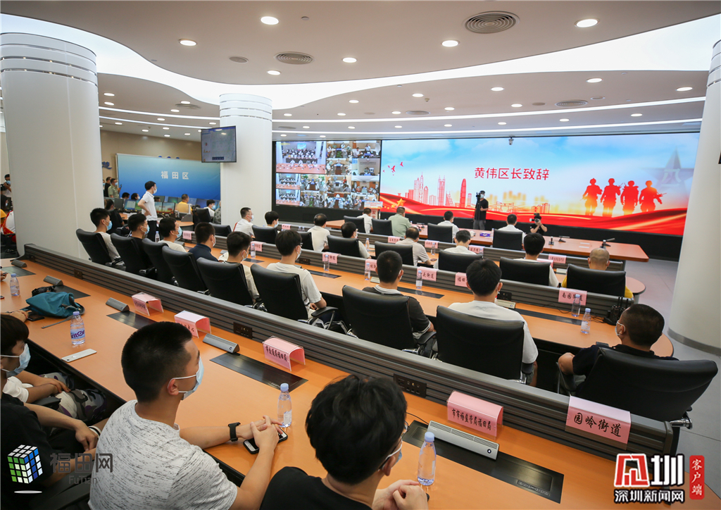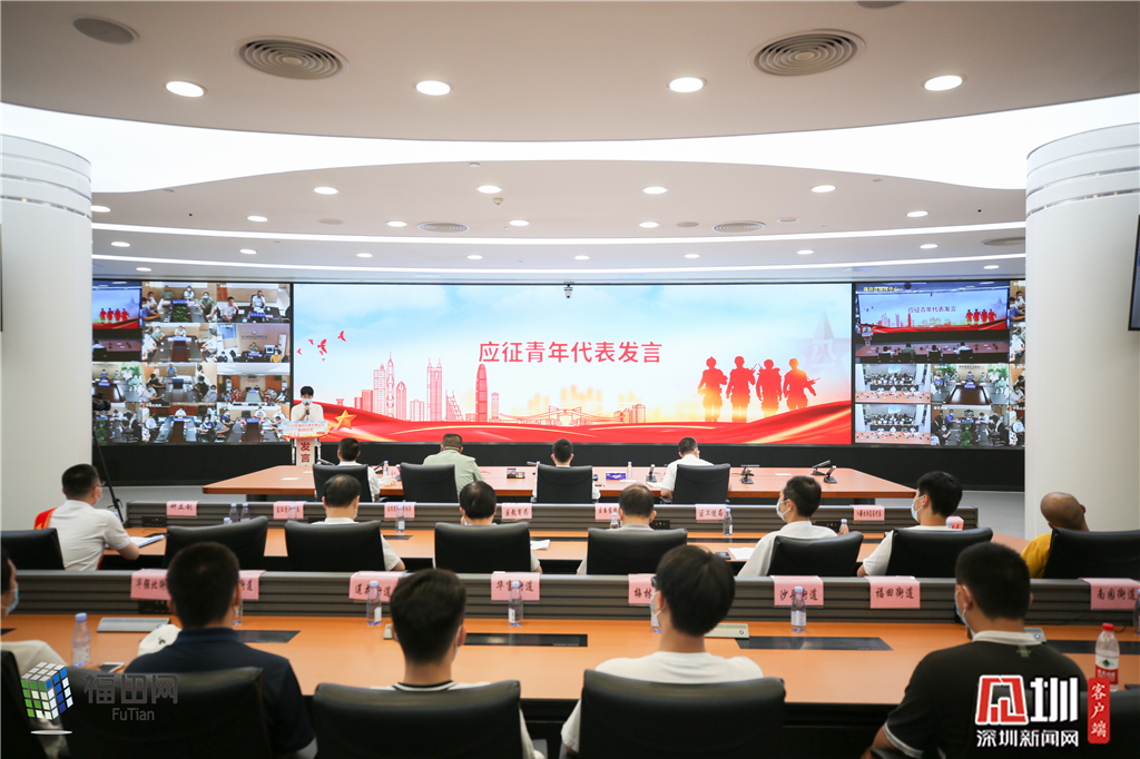 7月16日下午,福田区征兵办在区智慧城市指挥中心采取线上直播的方式,隆重举行“福田区2020年征兵启动仪式”。福田区委副书记、区长黄伟,区委常委、人武部长李惟海,副区长朱伟华,区公安分局政委张欣之在区委主会场出席会议,各街道党工委书记、武装部长及辖区适龄青年在各街道分会场参加会议。