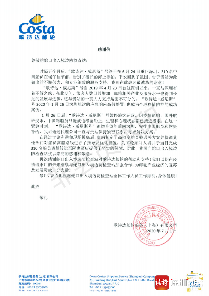 见圳客户端·深圳新闻网2020年7月16日讯(深圳特区报记者 戚金城 通讯员 罗劲松)“对于贵站为此做出的不懈努力,和专业细致的服务支持,我司在此表达最诚挚的谢意。”7月1日,一面写着“国门卫士 优质服务”的锦旗和一封感谢信千里迢迢从上海专程送达深圳出入境边防检查总站蛇口边检站。