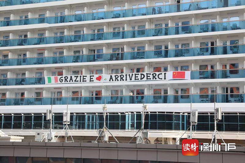 邮轮方在靠泊期间,特地在船舱外挂出写有意大利语“谢谢!再见!”及画有中国和意大利国旗的横幅,为疫情期间的多次人道主义援助表示感谢。7月8日,这些船员在接受14天的隔离医学观察后,踏上了返回家乡的路。