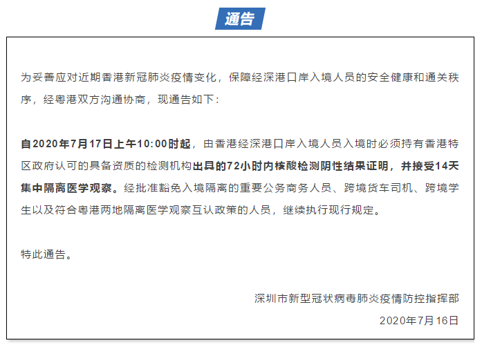 1、7月16日晚间,深圳市新型冠状病毒肺炎疫情防控指挥部调整由香港经深港口岸入境人员防控措施,由香港口岸入境人员须持72小时内核酸检测阴性结果证明,并接受14天集中隔离医学观察。