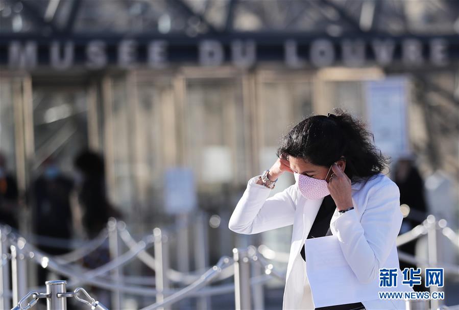 7月6日,一名女子在进入法国巴黎卢浮宫博物馆前戴上口罩。新华社记者高静摄