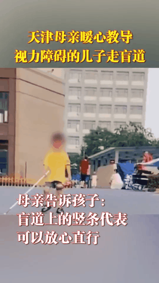 最近,天津一母亲教视力障碍儿子走盲道的视频火了。