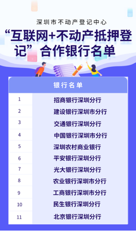 今年,深圳持续加快“互联网+不动产抵押登记”新模式的推广力度,全市可提供银行已达11家,包括:招商银行、建设银行、交通银行、中国银行、深圳农村商业银行、平安银行、光大银行、农业银行、工商银行、民生银行、北京银行。企业和市民在上述合作银行办理贷款和抵押权首次登记时,可以一次性提交抵押权首次登记相关材料,办理贷款后通过登记中心官网、微信公众号随时随地在线申请,实现抵押权登记“零跑动”,抵押权首次登记工作日“一天出证”。银行只需登录申办平台即可“一键”完成抵押权注销登记,真正实现抵押权注销登记“秒批”和“24小时不打烊”自助办理。