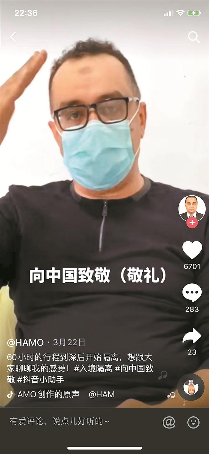 在方哈默所有抖音视频中,点赞量最高的是对中国防疫工作两次真情的致敬,他希望能借此呼吁所有入境人员都能百分之百遵从政府安排。“我希望能有更多人可以看到中国的防疫措施。”方哈默在视频中说道,“中国所有的防疫工作者都很赞,他们24小时不间断工作,你根本想象不到有多辛苦,我希望每个入境人员都百分之百遵守政府的安排。”他满怀信心地表示,接下来也会把在罗湖的抗疫短视频拍下去,希望借此机会可以把中国的声音传到更远的地方,向世界传递中国力量。