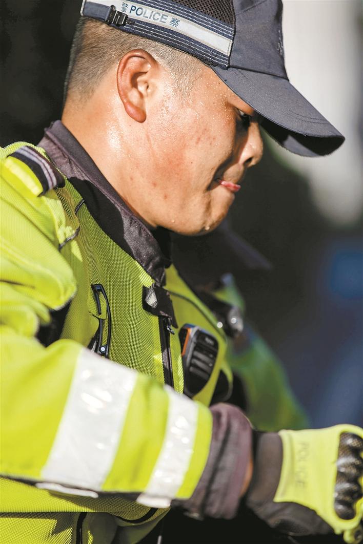 “深圳最近的天气太热了,到了中午,地面温度估计得有40℃了,我们因为戴着口罩,外头还得加上头盔,感觉确实挺难受的。”深圳交警南山大队机训中队的铁骑小哥时云财,每天早高峰开始就驾驶铁骑穿梭在大街小巷,直到中午太阳最盛的时候。摘下头盔,眼睫毛上都是汗滴,更不用说脱下荧光黄的制服,里面是层层叠叠早已被浸透发白的衣衫。