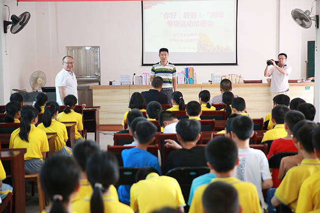 15日上午,隆重的“你好,暑假!”阅读专项活动推进会在中心小学礼堂举行。一段松坪二小孩子们的纪录片——《我的小学生活》拉开了活动的序幕。接着,松坪二小党支部书记张忠义同志、纪检委员张英明同志以及教科室副主任杨丹为四百多名孩子赠送了暑假礼物——课外书和精美的阅读手册,张书记鼓励孩子们积极参加“你好,暑假!”阅读活动,利用假期多读书、读好书、好读书,多与松坪二小的小伙伴们分享阅读收获,共享阅读的美好时光。随后,张书记还从参与度、愉悦度、开放度、有效度、自主度五个方面与中心小学的老师们分享了“五度”生本学堂的教学理念以及在阅读教学中的运用,并倡导老师们在教学中带领孩子们进行深度阅读、广泛阅读,让书籍成为孩子们心中最美的“知识种子”。