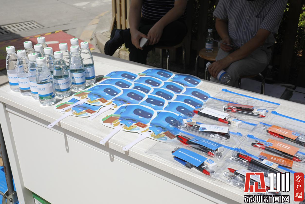 为考生和门口等待的家长准备的文具包、风扇和水。