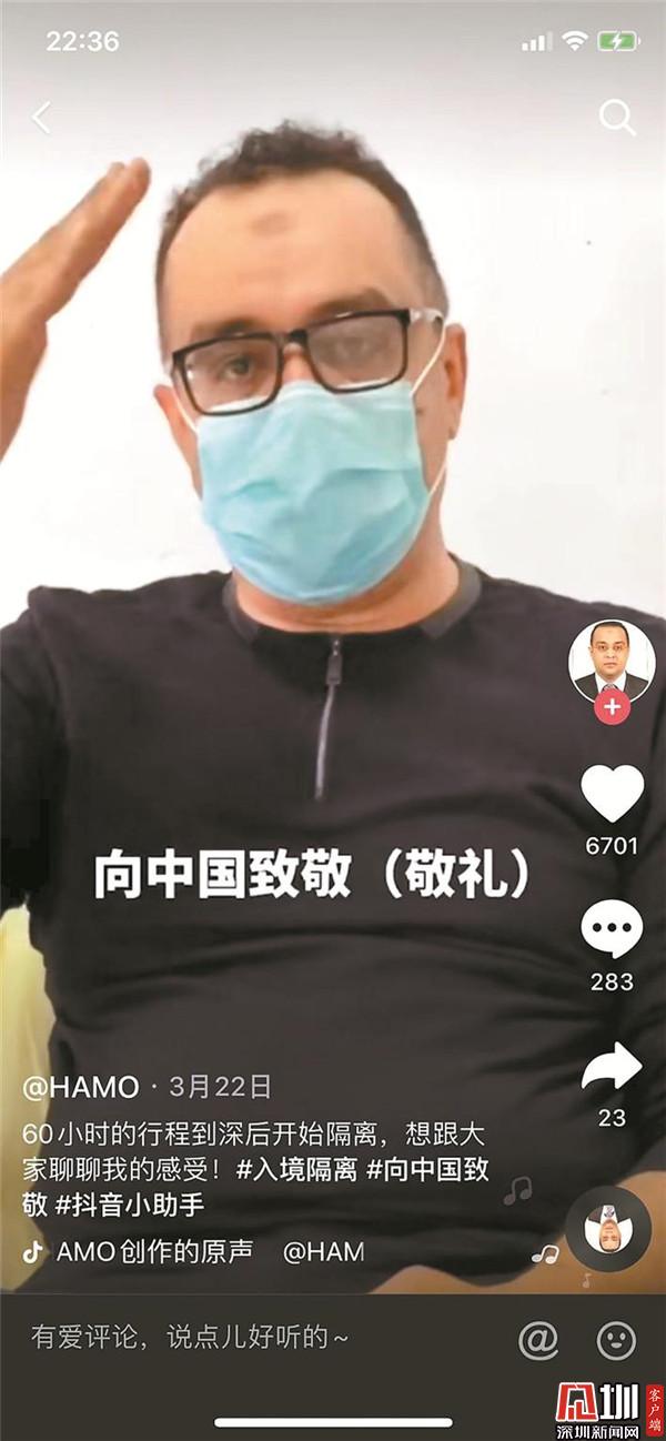 在方哈默所有抖音视频中,点赞量最高的是对中国防疫工作两次真情的致敬,他希望能借此呼吁所有入境人员都能百分之百遵从政府安排。“我希望能有更多人可以看到中国的防疫措施。”方哈默在视频中说道,“中国所有的防疫工作者都很赞,他们24小时不间断工作,你根本想象不到有多辛苦,我希望每个入境人员都百分之百遵守政府的安排。”他满怀信心地表示,接下来也会把在罗湖的抗疫短视频拍下去,希望借此机会可以把中国的声音传到更远的地方,向世界传递中国力量。