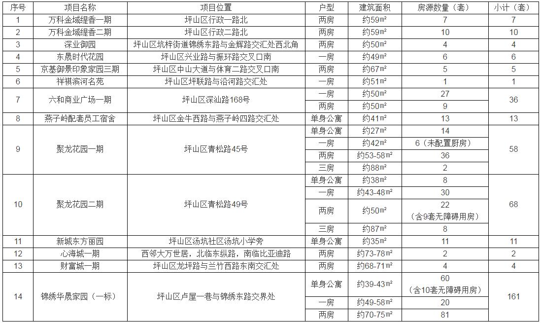 本次配租房源分布在万科金域缇香一期、万科金域缇香二期、深业御园、东晟时代花园等14个公共住房项目,其中单身公寓106套(含10套无障碍用房),一房90套,两房180套(含9套无障碍用房),三房10套。具体房源信息如下: