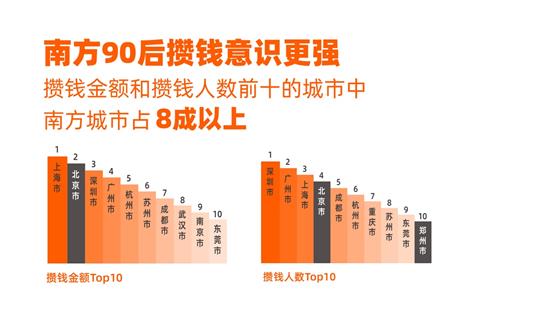 报告显示,90后攒钱金额和攒钱人数前十的城市中,南方城市占8成以上。其中,深圳90后攒钱人数在全国排名第一,攒钱金额全国排第三。在攒钱金额上,90后女生显示出了优越性,90后女生比男生更会攒钱,女生平均比男生攒钱金额高2成。而数据表明,在支付宝平台上持有基金的用户中6成是男性,女性较男性更倾向于稳健的理财方式。