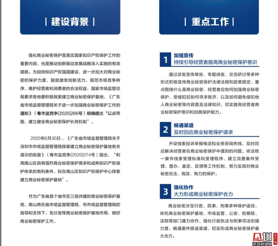 为深入贯彻落实党的十九届四中全会和党中央、国务院关于“加强和改进反不正当竞争执法”“加强企业商业秘密保护”的有关决策部署,根据市场监管总局的有关要求,广东省市场监督管理局认真组织部署高新技术密集的地区探索建立商业秘密保护基地。2020年6月30日,广东省市场监督管理局对《深圳市市场监督管理局关于探索建立商业秘密保护基地的请示》作出批复,支持并指导深圳市市场监督管理局在南山知识产权保护中心探索建立商业秘密保护基地,并对南山商业秘密保护基地提出四点要求:一是加强宣传,引导经营者提高商业秘密保护意识;二是畅通渠道,及时回应商业秘密保护需求;三是强化协作,大力形成商业秘密保护合力;四是建章立制,认真总结商业秘密保护经验。