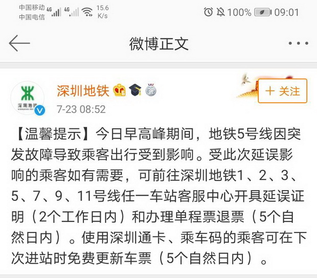 【温馨提示】今日早高峰期间,地铁5号线因突发故障导致乘客出行受到影响。受此次延误影响的乘客如有需要,可前往深圳地铁1、2、3、5、7、9、11号线任一车站客服中心开具延误证明(2个工作日内)和办理单程票退票(5个自然日内)。使用深圳通卡、乘车码的乘客可在下次进站时免费更新车票(5个自然日内)。