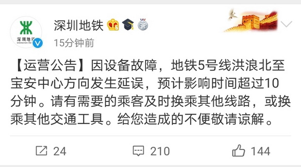 见圳客户端·深圳新闻网2020年7月23日讯(见圳客户端·深圳新闻网记者 陈致远)记者从深圳地铁了解到,因设备故障,地铁5号线洪浪北至宝安中心方向发生延误,预计影响时间超过10分钟。