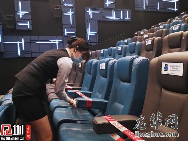 随后,工作人员带领记者走进一个刚散场的放映厅。记者在厅内看到,工作人员正在为座椅进行细致的清洁工作,为确保观众保持距离,一半座椅已被“封锁”,实行隔位就座。“每个放映厅都实行错时排场,每场上座率不超过30%,并延长放映间隔时间。观影途中安排了专门的巡视人员。观众离场后我们会立即对厅内进行消杀。”据悉,观众在进入影厅时有工作人员指引入座,观影途中禁止饮食且需全程佩戴口罩。