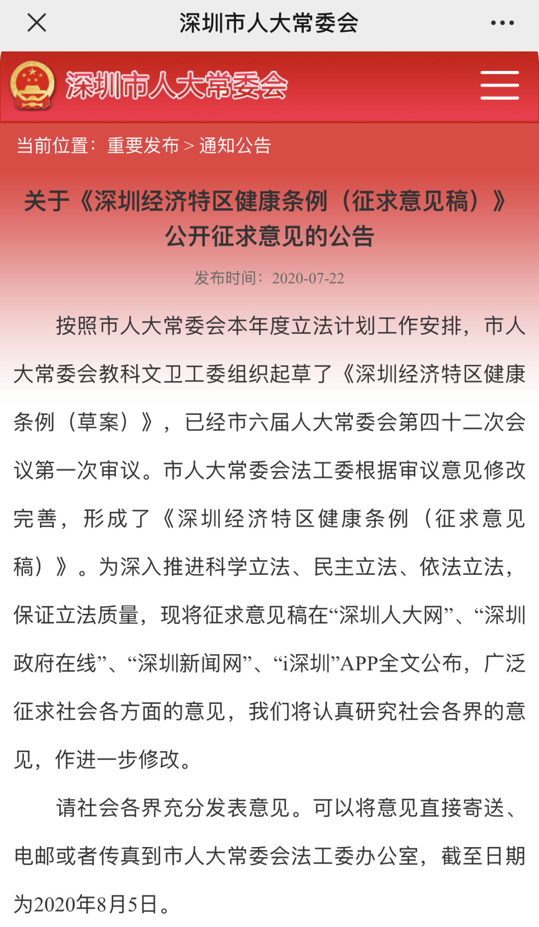 7月22日下午,该条例的征求意见稿在深圳市人大官网公布,向公众征求意见。