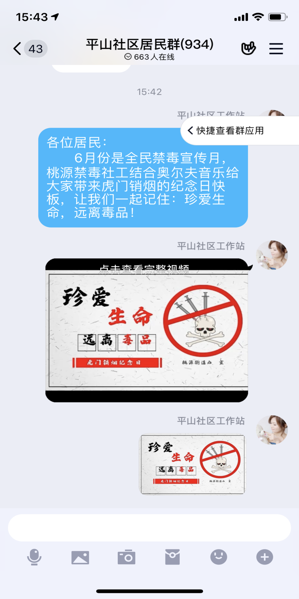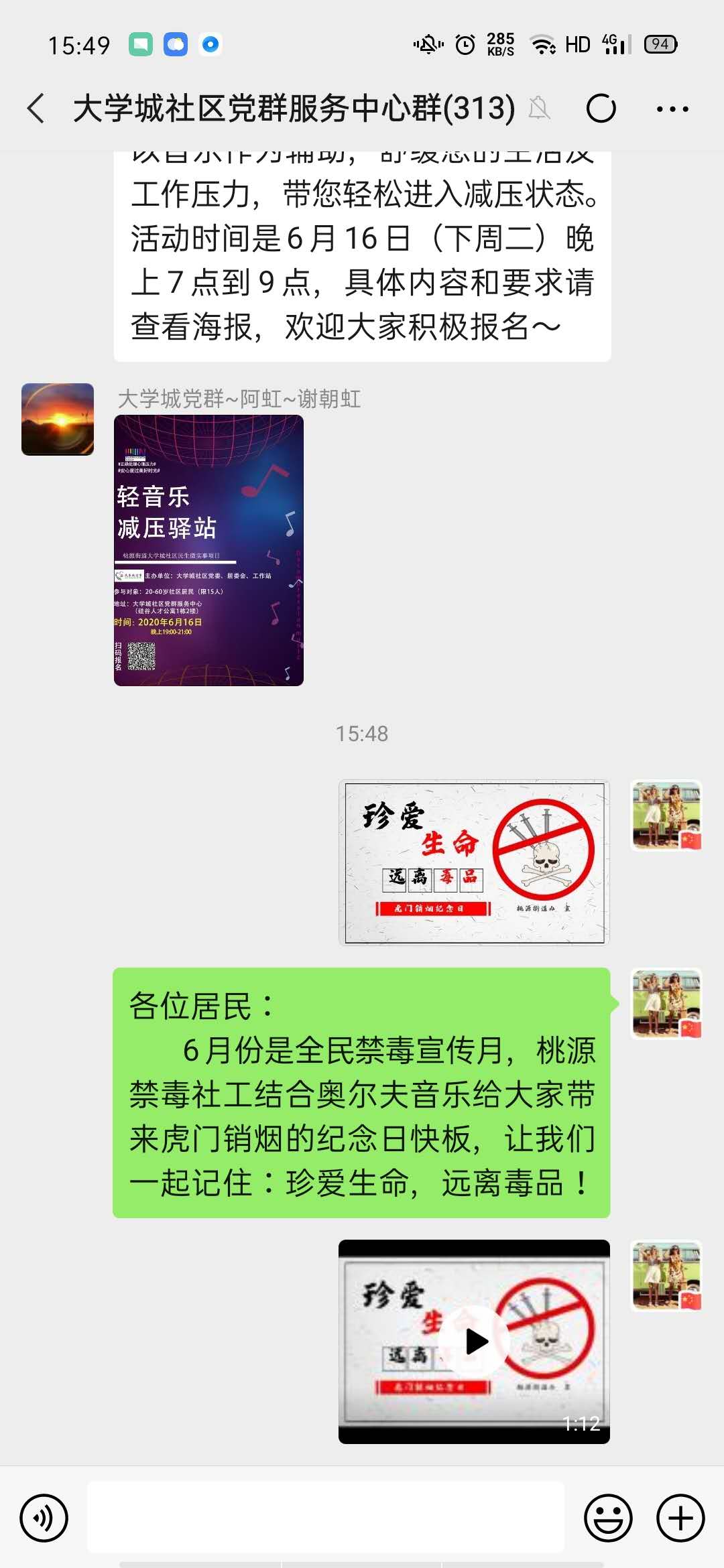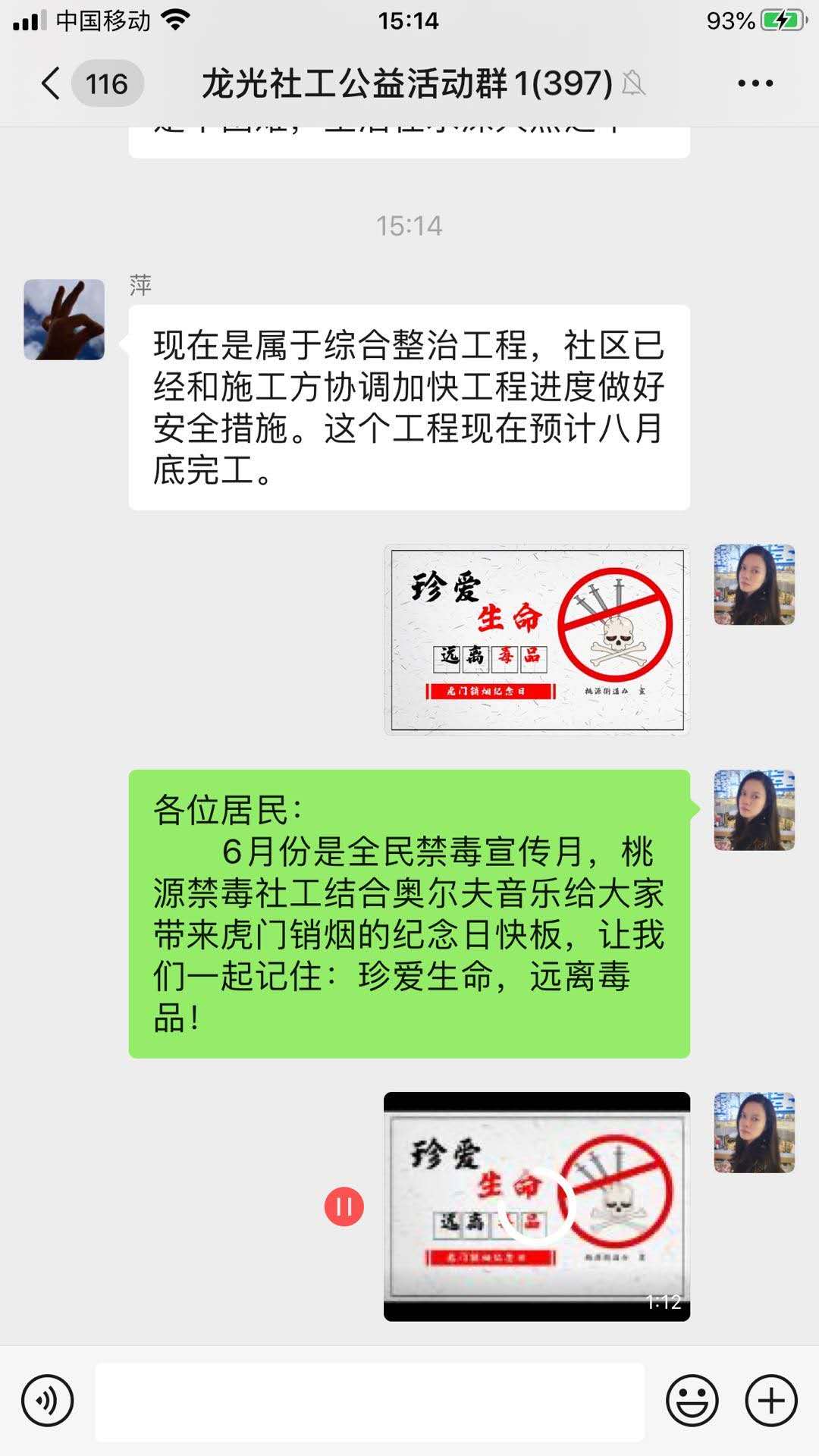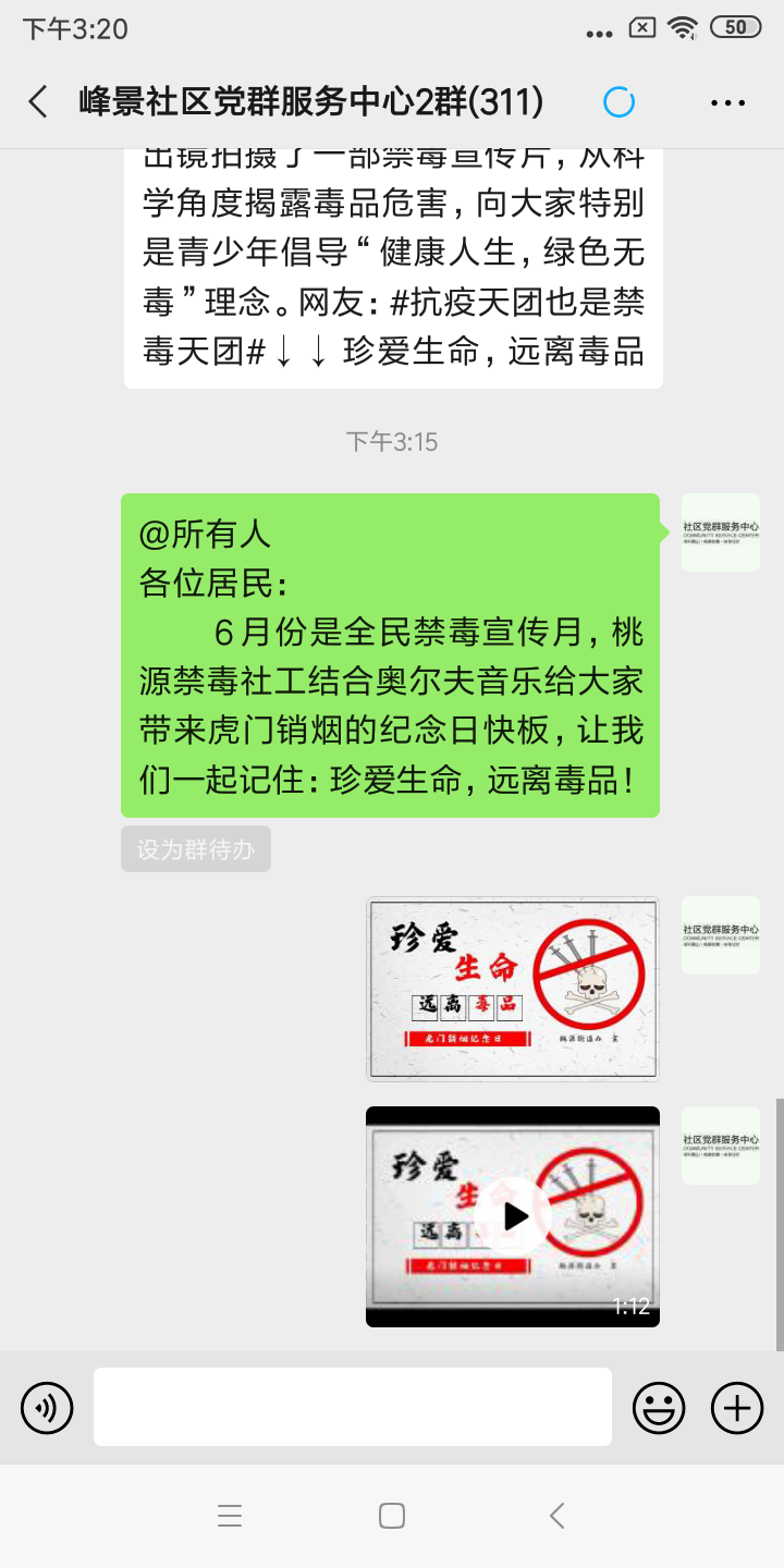 街道禁毒温馨社工充分利用微信网络群向社区居民推送禁毒宣传视频。视频最前面通过问答方式,先引出关于禁毒的节日,后面衔接一段即兴快板,通过快板形式讲述近代历史故事的现实影响,充分强调识毒、防毒、拒毒的重要性与毒品严重危害性。以视频拍摄、讲解毒品知识等形式,积极倡导辖区内居民参与到全民禁毒的行动之中,学会拒毒、防毒、拒毒。