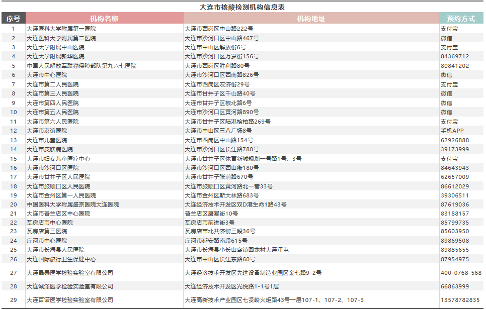 7月24日起,大连市人员原则上实施非必要不离连,确需离连的,须持7日内核酸检测阴性证明;冷藏冷冻肉品、海产品企业或场所从业人员尽快实施核酸检测。大连市对外核酸检测机构现有29家,机构地址和预约方式,市民可登录大连市卫生健康委官方网站进行查询。