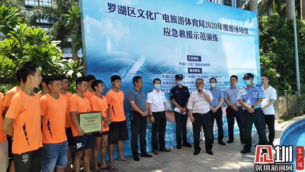 深圳新闻网讯(见圳客户端、深圳新闻网记者 韩翔)2020年7月暑期刚开始,罗湖区文化广电旅游体育局高度重视游泳场馆安全工作,特意在罗湖区桂园街道蔡屋围老围花园泳池小区举行了一次的游泳经营单位应急救生示范演练,活动由段昌忠主持。为配合防疫工作,减少人员聚集,创新安全生产培训新形式,组织辖区同行近300人、同时辖区歌舞、网吧、游艺等行业安全负责人超千人同时上线观看直播学习,取得了圆满成功。