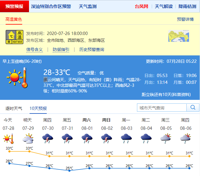 见圳客户端•深圳新闻网2020年7月28日讯 根据深圳气象局官方消息,7月28日白天多云间晴天,天气闷热,有短时(雷)阵雨;气温28-33℃,中北部最高气温可达35℃以上;西南风2-3级;相对湿度60%-90%。