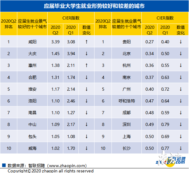 《报告》显示,二季度应届生CIER指数较高的城市为二、三线城市,例如,咸阳、大庆、惠州、合肥和淮安等,这些城市的CIER指数均要高于1。而在应届生就业景气较差的城市中,北上广深等一线城市,以及杭州、南京、成都等新一线城市的应届生CIER指数相对较低,就业竞争相对激烈。
