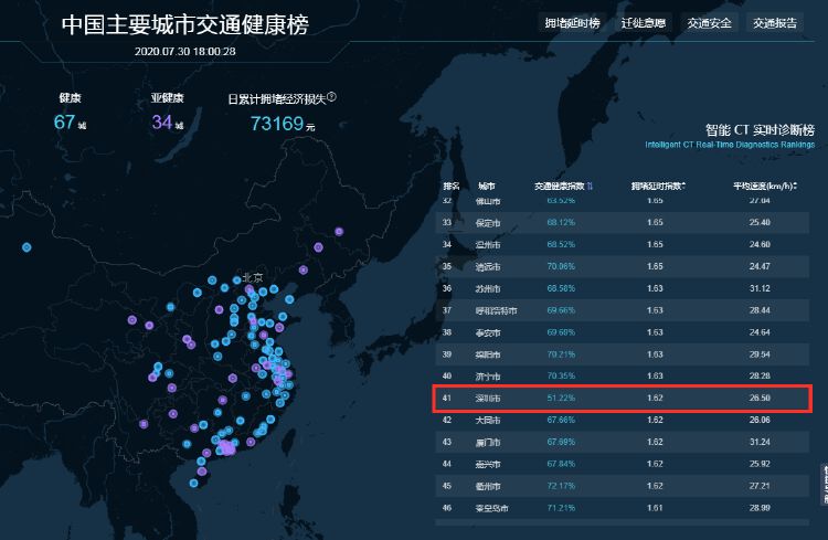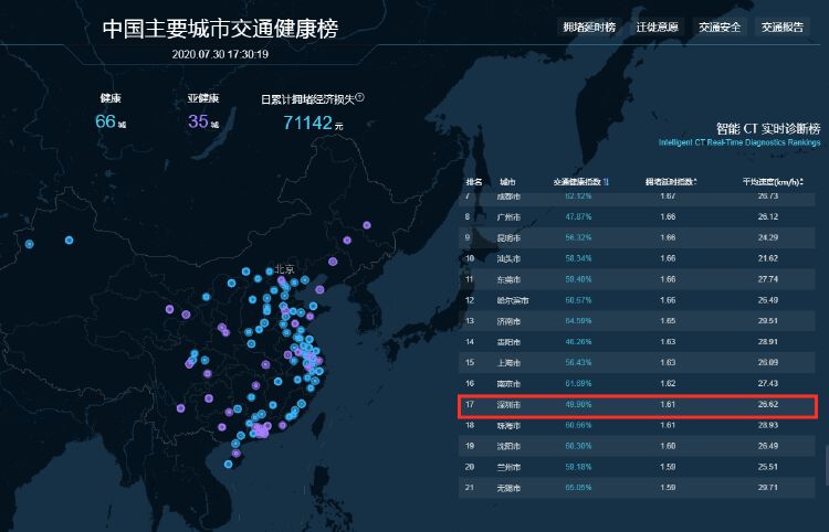 记者7月30日在高德地图拥堵延时实时榜上看到,17:30分,晚高峰开始之际,深圳拥堵延时指数为1.61,排名全国第17位。