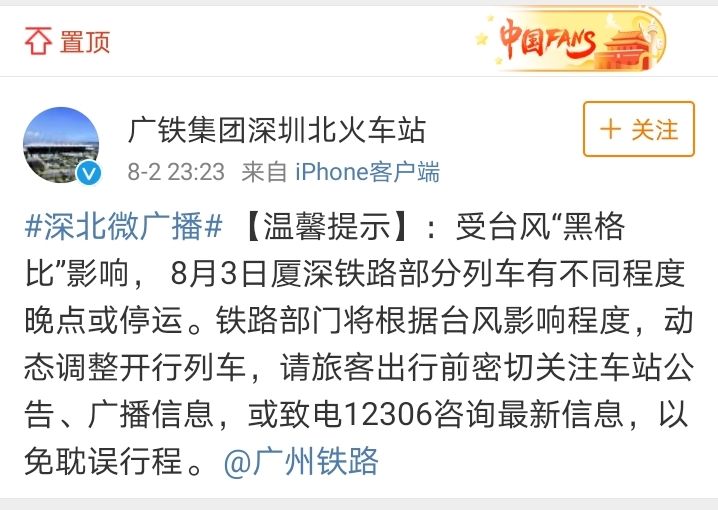 见圳客户端·深圳新闻网2020年8月3日讯(记者 陈致远)记者从深圳北站了解到,受台风“黑格比”影响,8月3日厦深铁路部分列车有不同程度晚点或停运。铁路部门将根据台风影响程度,动态调整开行列车,请旅客出行前密切关注车站公告、广播信息,或致电12306咨询最新信息,以免耽误行程。