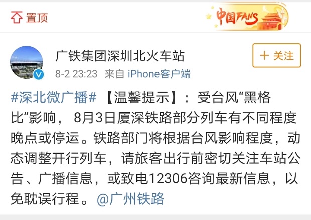 受台风“黑格比”影响 8月3日深圳北站部分列车停运