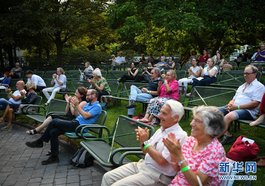 8月1日,在德国法兰克福棕榈园,人们观看一场户外音乐会。新华社记者逯阳摄