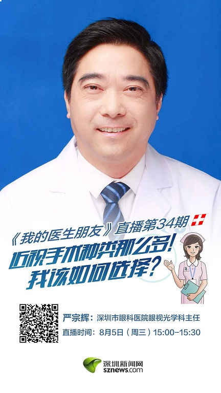 见圳客户端·深圳新闻网2020年8月4日讯(记者刘梦婷 唐丽玲)“戴上眼镜不方便,取下眼镜看不见,想要手术复光明,又怕出现大风险”——这大概就是所有近视患者的普遍心理。随着技术手段的不断进步,近视手术的种类也多起来,哪种手术安全可靠且更适合自己?8月5日下午15时,《我的医生朋友》第34期将邀请深圳市眼科医院眼视光学科主任严宗辉跟大家分享关于近视手术选择的知识。