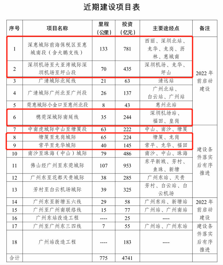 按照规划,近期将建设13个城际铁路和5个枢纽工程项目,总里程约775公里。其中,2022年前启动深惠城际前海保税区至惠城南段(含大鹏支线)、深圳机场至大亚湾城际深圳机场至坪山段、穗莞深城际南延等6个城际铁路项目和广州东站改造工程等3个枢纽工程建设,规划建设里程337公里;待相关建设条件落实后,将有序推进塘厦至龙岗城际、常平至龙华城际等7个城际铁路项目和广州站改造工程等2个枢纽工程实施,规划建设里程438公里。