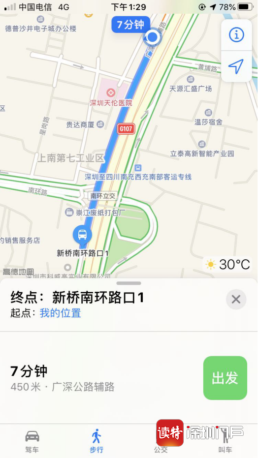 随后,记者又从此侧站台导航南向步行至南环立交天桥,导航预计时间是7分钟,记者步行大约450米,花时也是7分钟;如果绕回东侧电子城站台,花时大约15分钟。