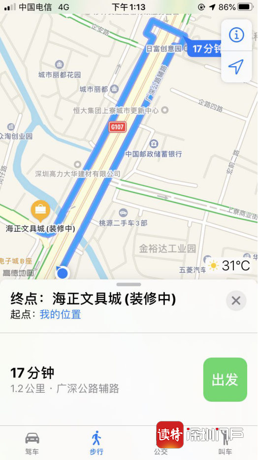 下午1点13分,记者到达107国道东侧沙井电子城公交站后,用手机导航步行至对面的公交站。根据导航显示,到达对面沙井公交站附近的海正文具城需要步行1.2公里,预计花时17分钟。记者北向步行至上寮市场公交站旁的人行天桥花时8分钟,到达107国道西侧沙井电子城公交站时是1点27分,实际花时14分钟。