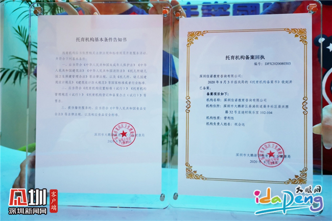 见圳客户端•深圳新闻网8月6日讯(见圳客户端、深圳新闻网记者 凌安儿 通讯员 刘梅)8月6日,深圳佳诺教育咨询有限公司(佳诺国际婴幼中心-深圳亚迪园)领取到大鹏新区教育和卫生健康局颁发的全市首张“托育机构备案回执”和“托育机构基本条件告知书”。