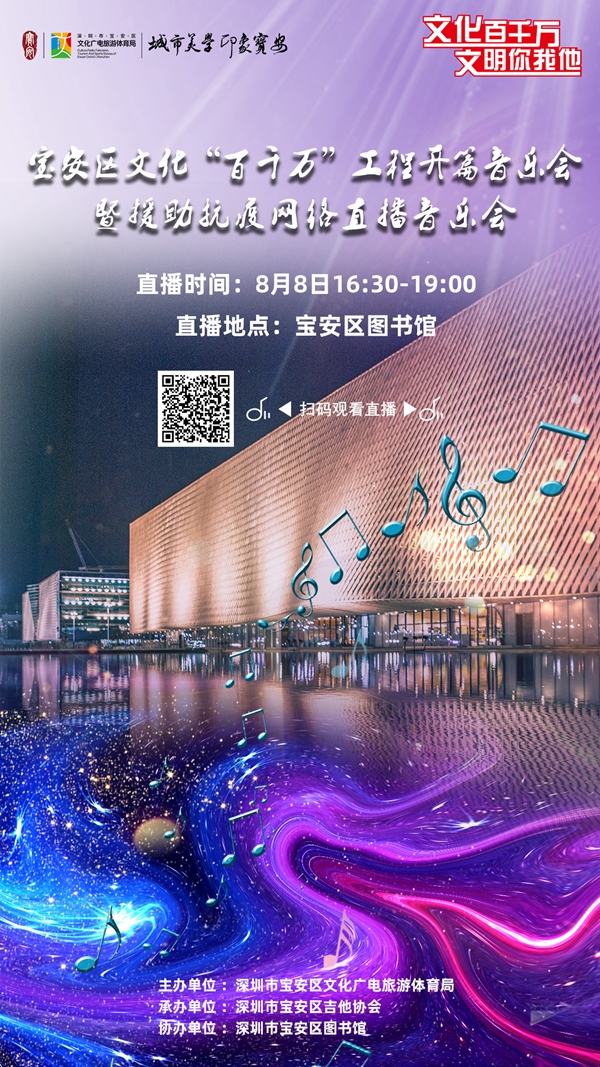 深圳新闻网宝安讯(见圳客户端、深圳新闻网记者 曾舒琪)@宝安人,你们期待已久的音乐盛宴要回来啦!本周六(8月8日)下午4:30,由宝安区文化广电旅游体育局主办、宝安区吉他协会承办、宝安区图书馆协办的宝安区文化“百千万”工程开篇音乐会暨援助抗疫网络直播音乐会将在宝安区图书馆东侧广场举办,届时,一场时长2个半小时的音乐会将以“现场演出+线上直播”的形式与大家邂逅,共赴音乐盛宴。这也标志着宝安区文化“百千万”工程全面恢复开展。