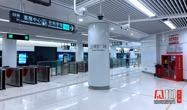 据悉,公明广场站为地下二层侧式车站,结构形式为全框架结构,整体基调以白色为主。站点地下一层为站厅站台同层,层高5.50米,设备区位于公共区的东西两端,中部为公共区;地下二层为车站过轨换乘通道,层高3.75米。该站毗邻公明综合市场、光明大仟里等商业项目,地铁开通后将扩大商圈辐射面,为各商业业态带来强大客流。