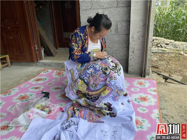 隆林各族自治县的一位村民,正在自家新房前绣十字绣,这是她的主要收入来源。