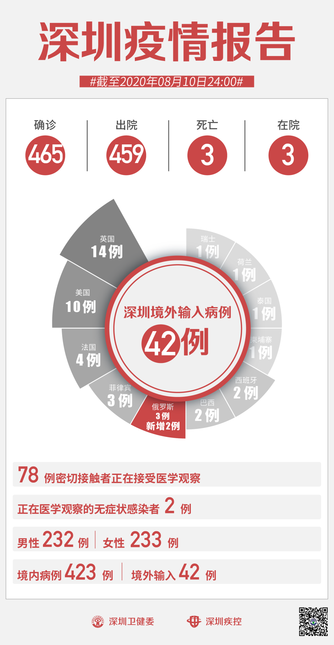 截至8月10日24时,深圳市累计报告新冠肺炎确诊病例465例。目前在院3例。