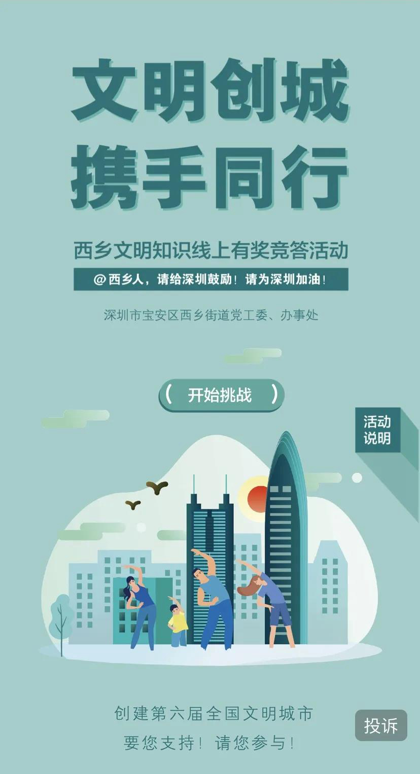 深圳新闻网宝安讯(见圳客户端、深圳新闻网记者 曾舒琪 梁婷婷)文明城市呼唤文明市民,文明市民创建文明城市。深圳文明城市建设,需要每一个来自西乡的你我共同尽一份力。8月12日,由西乡街道党工委、办事处主办的“文明创城 携手同行”西乡文明知识线上有奖竞答活动正式上线啦!当前,深圳正在全力争创第六届全国文明城市。@西乡人,让我们一起行动起来,学习文明知识,自觉遵守公共秩序,践行文明守则,为建设文明西乡尽一份心、出一份力。