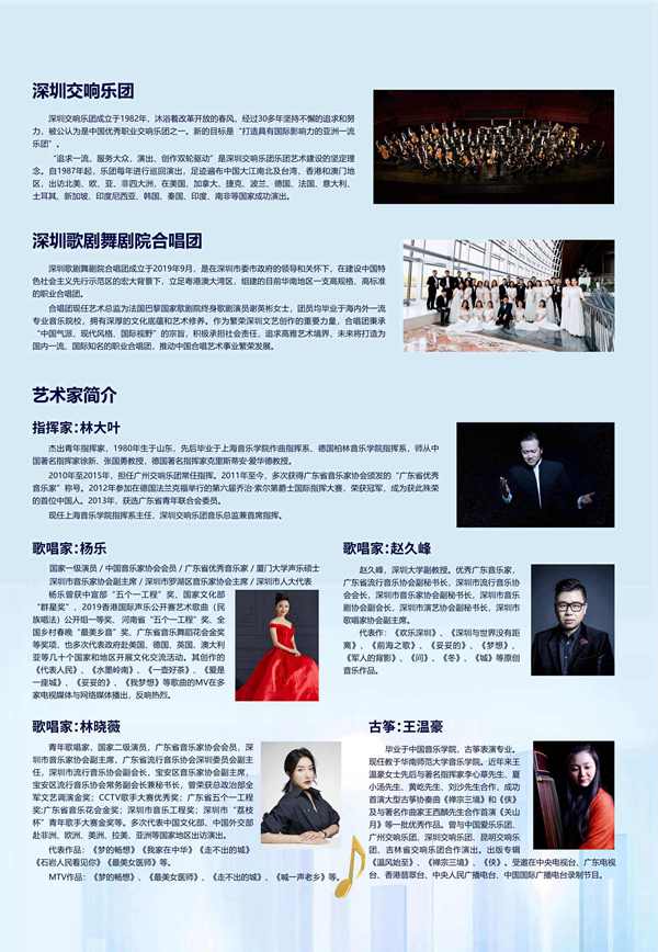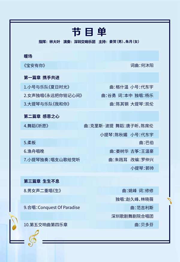 本场音乐会由深圳交响乐团音乐总监兼首席指挥林大叶先生担任指挥,深圳交响乐团演奏。音乐会分为《携手共进》《感恩之心》《生生不息》三个篇章,共有10首曲目。