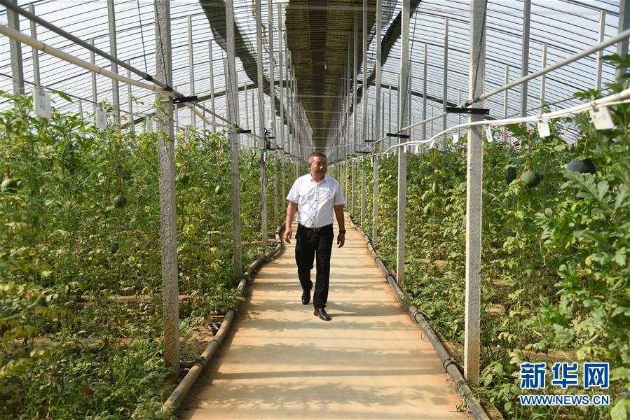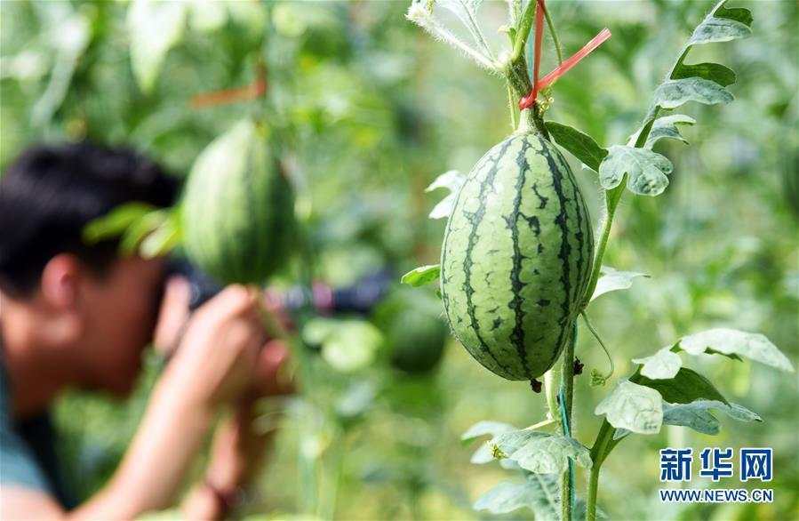工作人员在潍坊市寒亭区国家现代农业产业园西瓜大棚内查看西瓜长势(7月21日摄)。新华社记者王凯摄