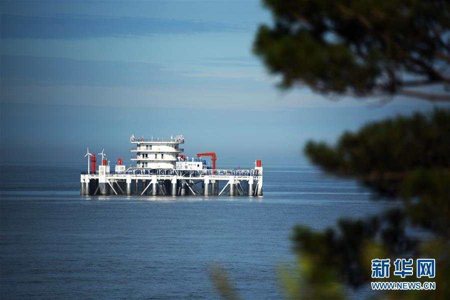 这是8月8日拍摄的应用5G技术的山东长岛综合试验区南隍城国家级海洋牧场示范区海上平台(无人机照片)。新华社记者王凯摄