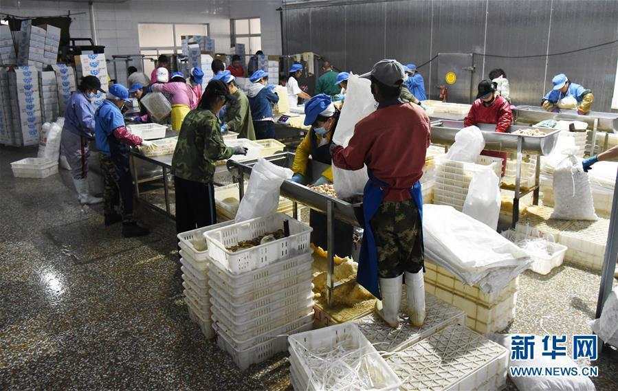 工人在山东省长岛综合试验区北长山乡北城村合作社办的海鲜加工企业内对扇贝进行加工、包装(8月10日)。新华社记者王凯摄
