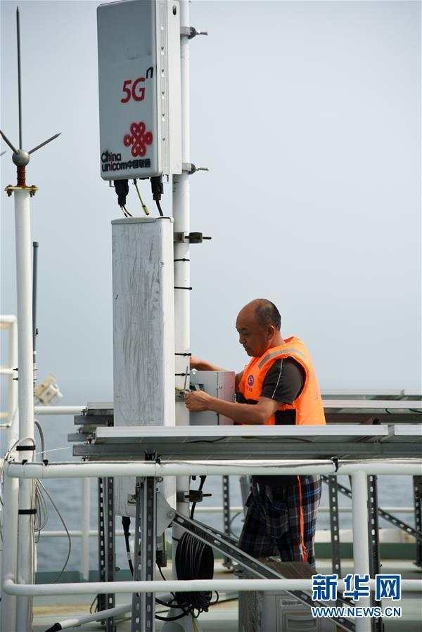 工作人员在山东长岛综合试验区南隍城国家级海洋牧场示范区海上平台上检查5G设备(8月8日摄)。新华社记者王凯摄