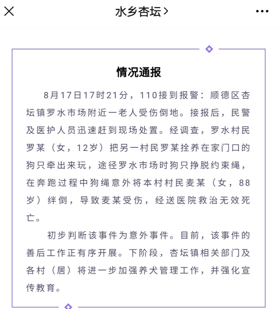 见圳客户端•深圳新闻网2020年8月19日讯 8月18日,据佛山市顺德区杏坛镇通报,8月17日17时21分,110接到报警:顺德区杏坛镇罗水市场附近一老人受伤倒地。接报后,民警及医护人员迅速赶到现场处置。经调查,罗水村民罗某(女,12岁)把另一村民罗某拴养在家门口的狗只牵出来玩,途径罗水市场时狗只挣脱约束绳,在奔跑过程中狗绳意外将本村村民麦某(女,88岁)绊倒,导致麦某受伤,经送医院救治无效死亡。