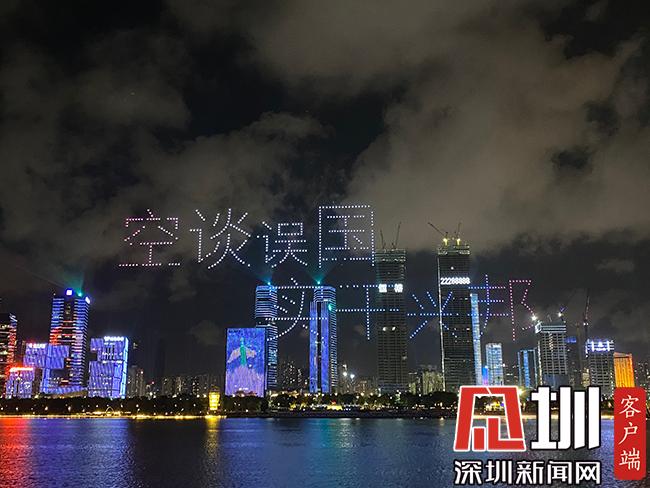当晚8时26分,在深圳人才公园语录石广场,826架无人机组成的编队腾空而起,随地面背景音乐和地面灯光布阵交错起落,变化出万千姿态。彼岸楼群,“春笋”大厦、深圳湾一号等摩天大楼的幕墙光影浮动,最美“中国红”瞬间点亮深圳湾城市天际线。