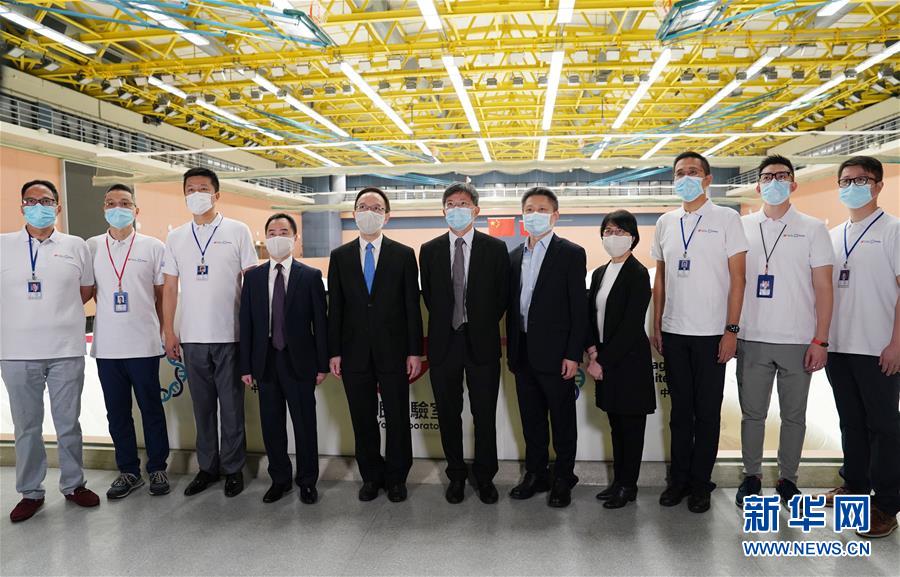 8月26日,香港特区政府检测工作组和内地核酸检测支援队的相关人士视察“火眼实验室”之前,拍照纪念。新华社记者李钢摄