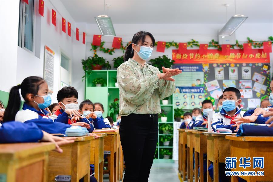 9月1日,西宁市城西区虎台小学老师薛晓霞在开学第一课上给学生讲解七步洗手法。当日,青海省西宁市迎来小学开学首日,西宁市城西区虎台小学围绕爱国主义教育、航空航天、节约粮食、卫生防疫等主题开展开学第一课。新华社记者 张龙 摄